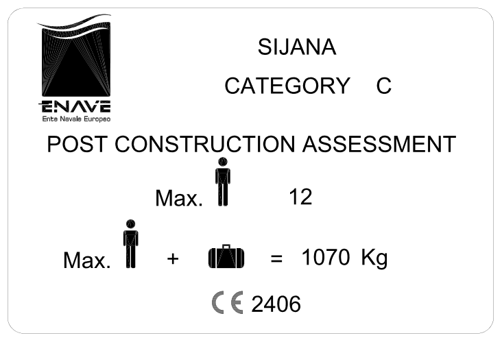 A.3.6. Najveće opterećenje prema preporuci proizvođača: Procijenjeno od strane prijavljenog tijela prema relevantnom standardu. Najveća nosivost, ograničenje posade i projektna kategorija su strogo povezani. Odnos između tri stavke dan je u Standardu za stabilitet i uzgon