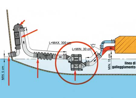 Ojačana plastična vodena brava s rotirajućim priključcima. Kompaktna, može se montirati na uskim mjestima. Treba je instalirati na sustavima ispuha hlađenim vodom. Kapacitet: prigušivači H 254 mm = 4,5 Lt. prigušivači H 362 mm = 10 Lt.